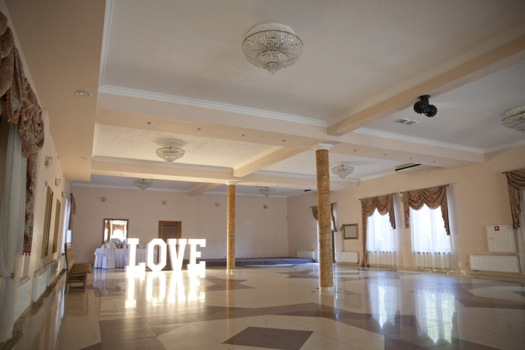 Nasze wnętrza to trzy stylowe sale, które pomieszczą do 350 gości. Dzięki różnym ustawieniom stołów możemy dostosować przestrzeń do Twoich potrzeb – od przyjęć weselnych po uroczyste kolacje.